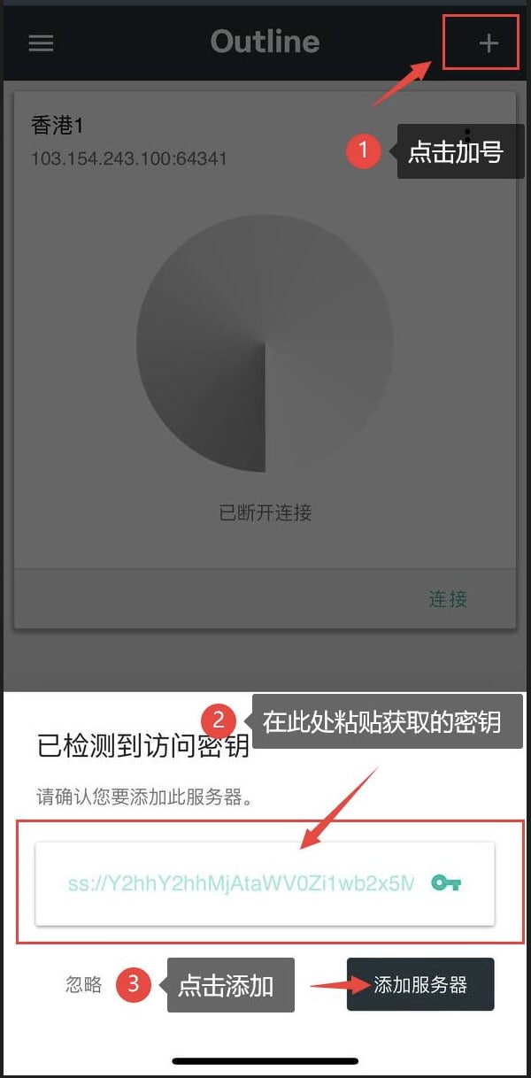 - 获取完密钥后,在桌面打开outline客户端,点击右上角“加号”,然后在输入框里粘贴刚刚获取的密钥,最后点击“添加服务器” .
